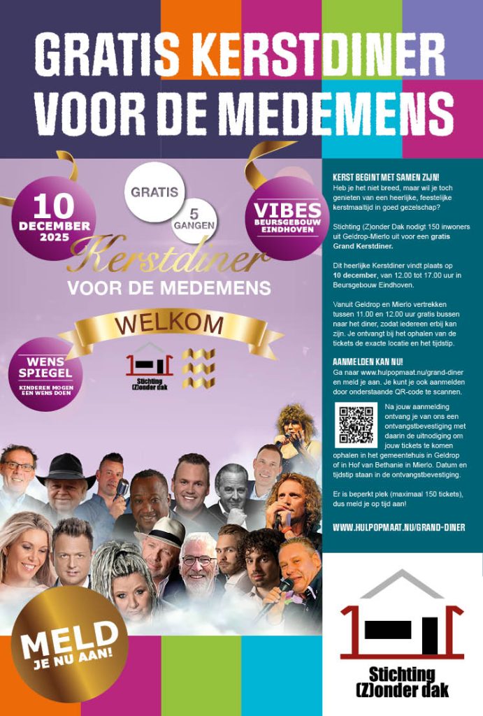 Stichting (Z)onderDak nodigt 150 inwoners van Geldrop-Mierlo met een laag inkomen uit voor een gratis Grand Kerstdiner. Dit vijfgangendiner vindt plaats op 10 december, van 12.00 tot 17.00 uur in Beursgebouw Eindhoven. Alle gasten genieten daar van een gratis vijf gangen diner met muziek en speciale activiteiten voor de kinderen.